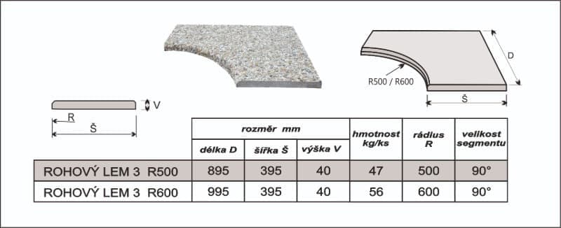 - Rovný lem se používá v kombinaci s rohovými segmenty na lemování bazénů různých tvarů (viz pokládka).