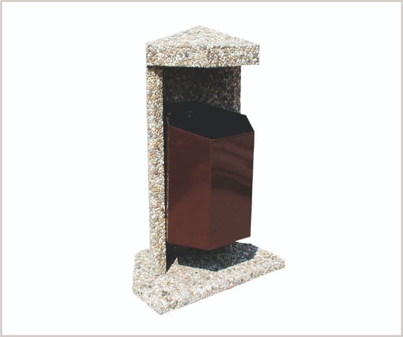 Betonový odpadkový koš s výklopnou stříškou ve vymývaném povrchu. Stříška se dodává bez popelníku nebo s popelníkem. Do koše lze vložit pytel na odpad, pytel se uchytí dodávaným pozinkovým rámečkem.