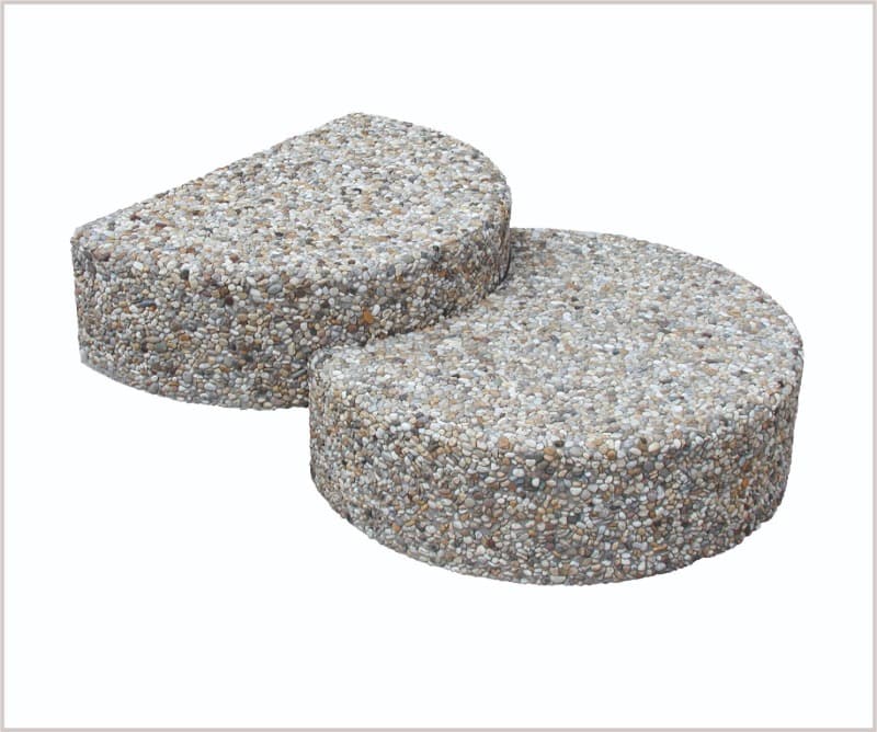 - Betonová dlaždice ve tvaru kruhové chodníkové výseče s povrchem vymývaného oblázku barvy přírodní, nebo vymývané různobarevné drtě.